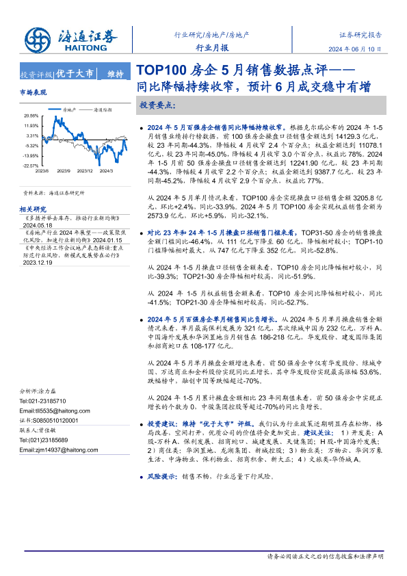 【海通证券】【20240610】TOP100房企5月销售数据点评:同比降幅持续收窄,预计6月成交稳中有增-10页