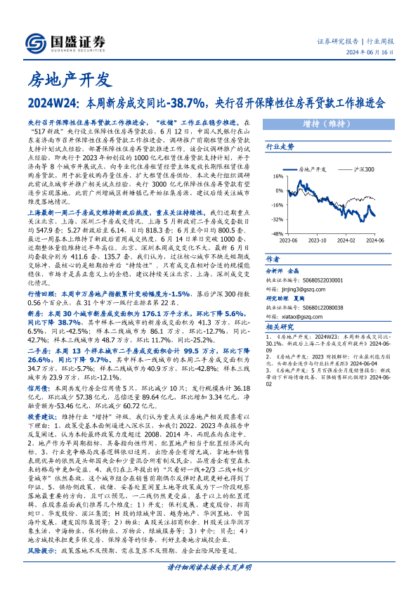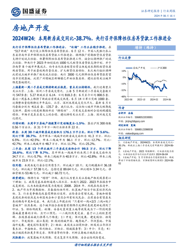 【国盛证券】【20240616】房地产开发行业2024W24:本周新房成交同比-38.7%,央行召开保障性住房再贷款工作推进会-14页