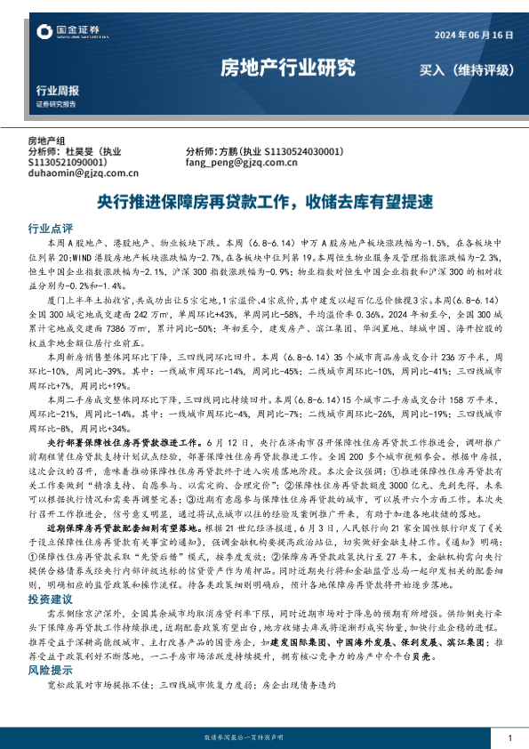【国金证券】【20240616】房地产行业研究:央行推进保障房再贷款工作,收储去库有望提速-18页