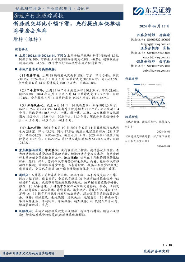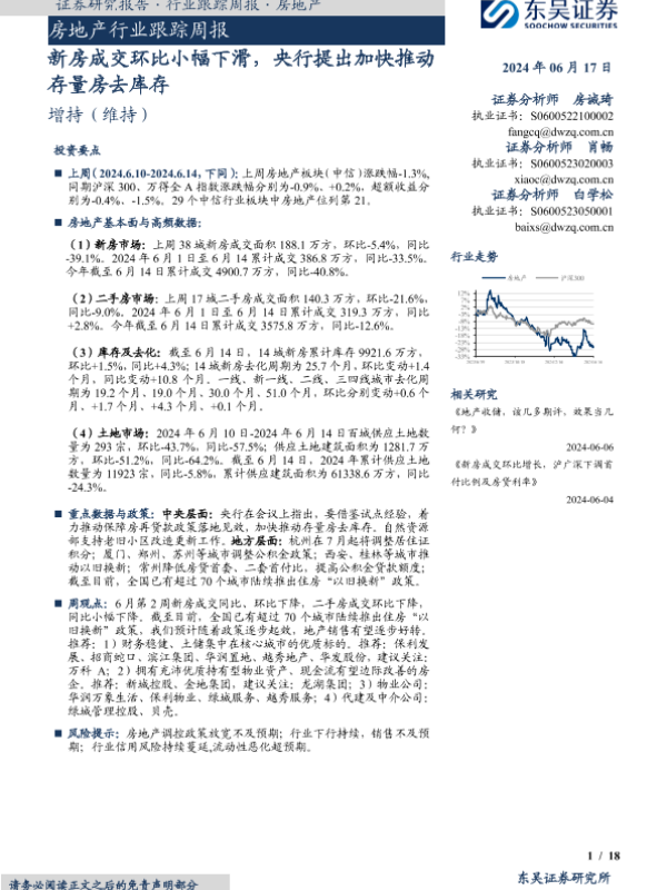 【东吴证券】【20240617】房地产行业跟踪周报:新房成交环比小幅下滑,央行提出加快推动存量房去库存-18页