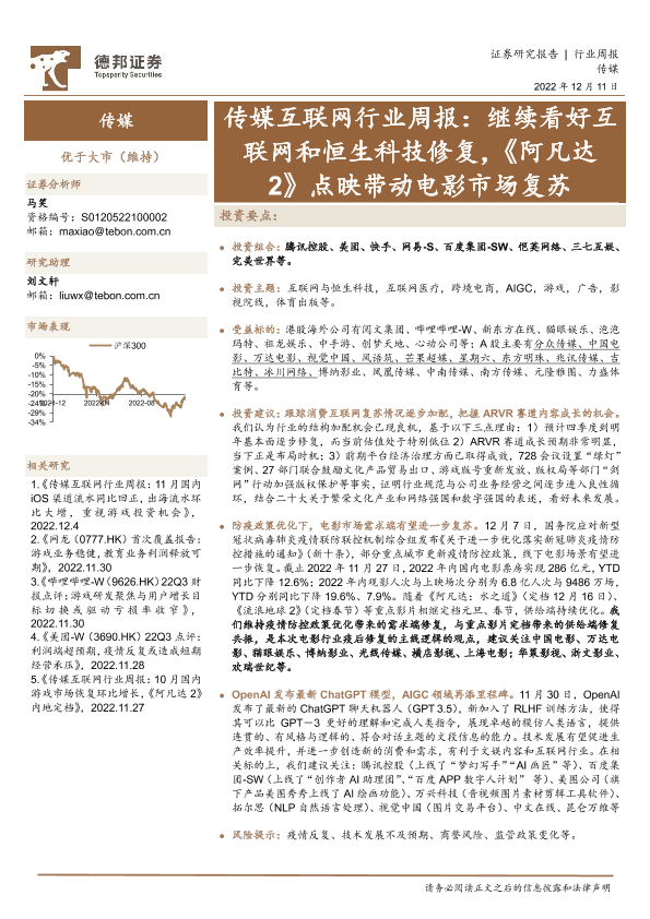 【德邦证券】【20221211】传媒互联网行业周报:继续看好互联网和恒生科技修复,《阿凡达2》点映带动电影市场复苏-16页