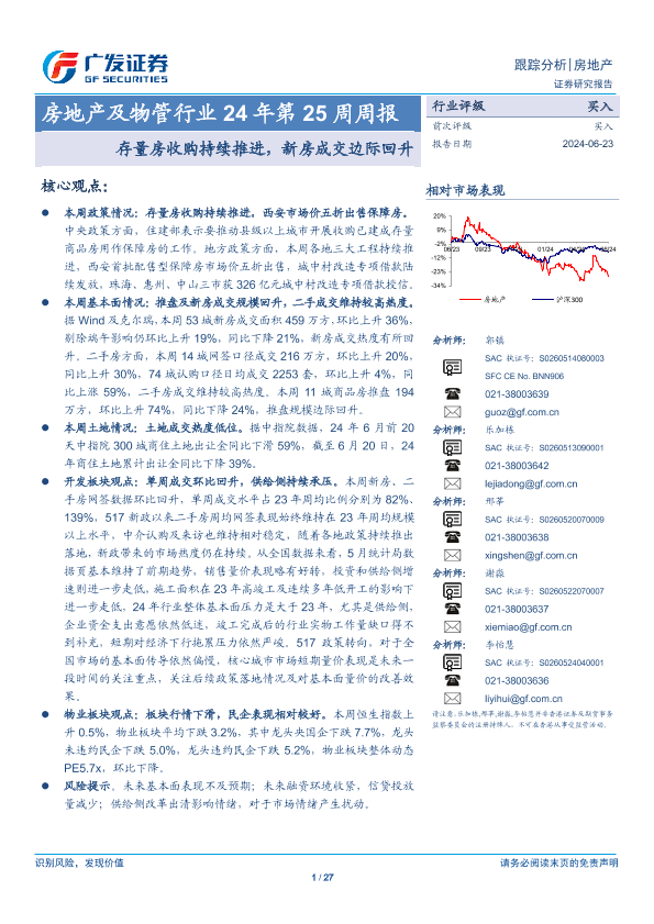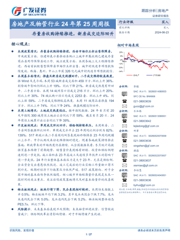 【广发证券】【20240623】房地产及物管行业24年第25周周报:存量房收购持续推进,新房成交边际回升-27页