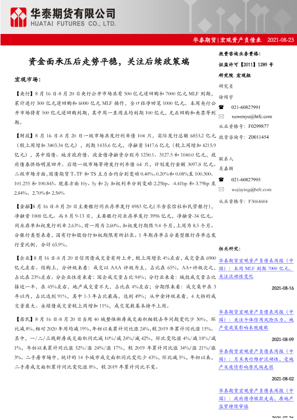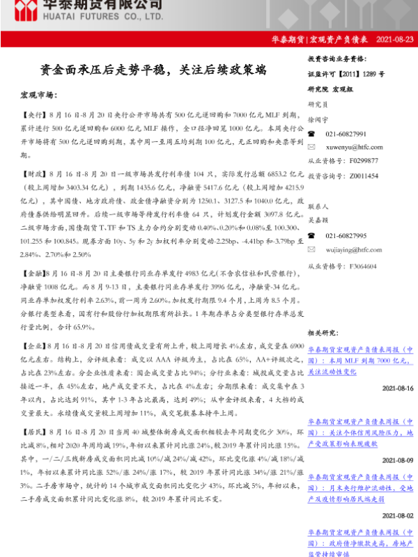 【华泰期货】【20210823】宏观资产负债表:资金面承压后走势平稳,关注后续政策端-17页