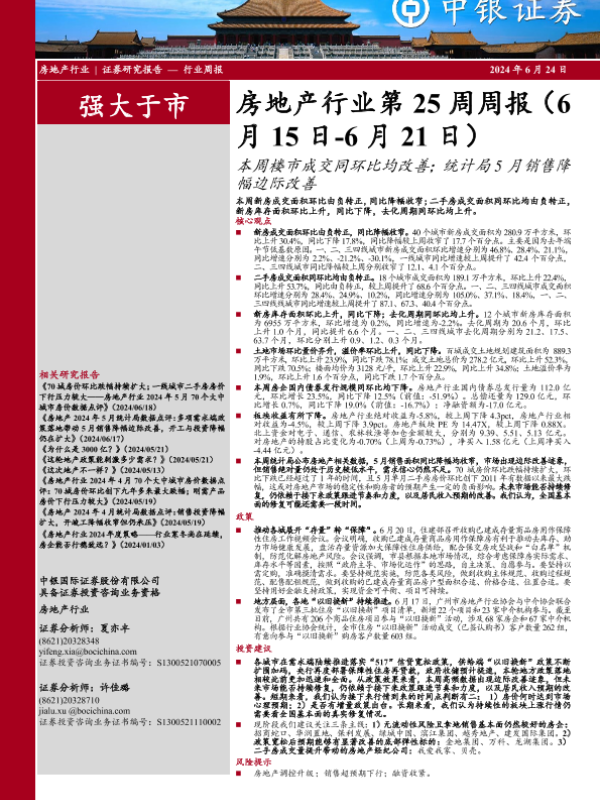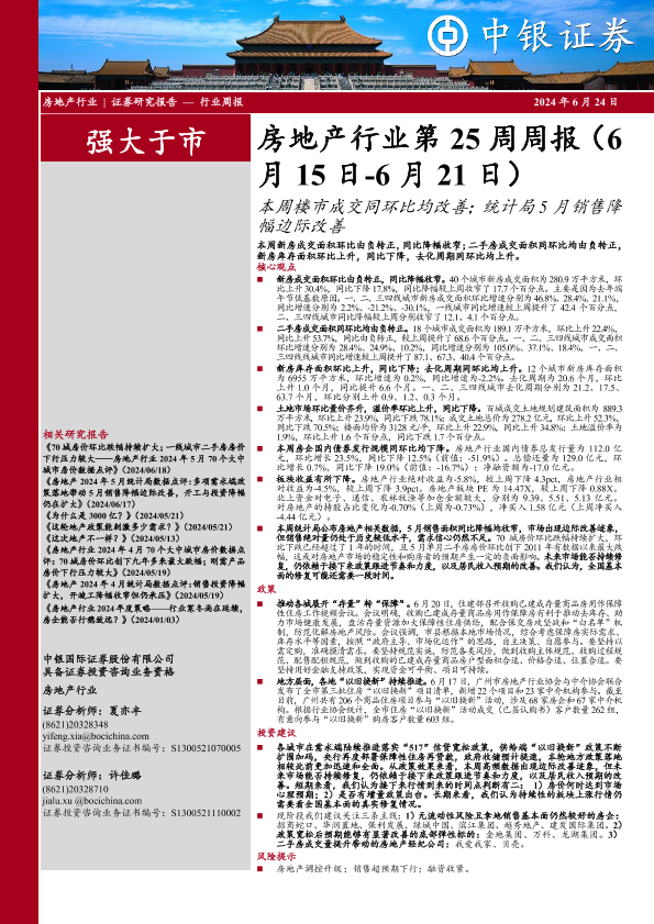 【中银证券】【20240624】房地产行业第25周周报:本周楼市成交同环比均改善;统计局5月销售降幅边际改善-26页