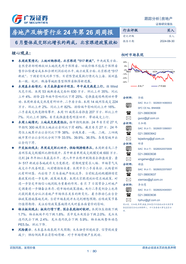 【广发证券】【20240630】24年第26周周报:6月整体成交环比增长约两成,北京跟进政策放松-30页