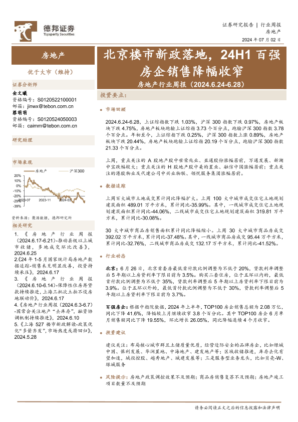 【德邦证券】【20240702】北京楼市新政落地,24H1百强房企销售降幅收窄-12页