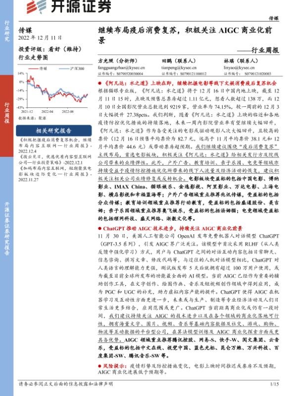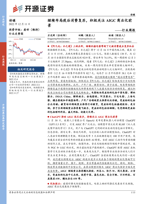 【开源证券】【20221211】传媒行业周报:继续布局疫后消费复苏,积极关注AIGC商业化前景-15页