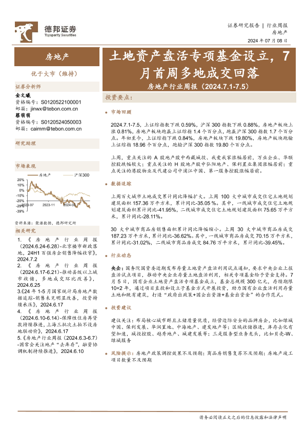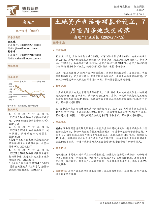 【德邦证券】【20240708】房地产行业周报:土地资产盘活专项基金设立,7月首周多地成交回落-12页