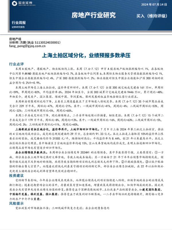 【国金证券】【20240714】上海土拍区域分化,业绩预报多数承压-21页