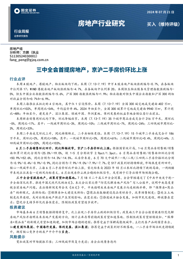 【国金证券】【20240721】房地产行业研究:三中全会首提房地产,京沪二手房价环比上涨-20页