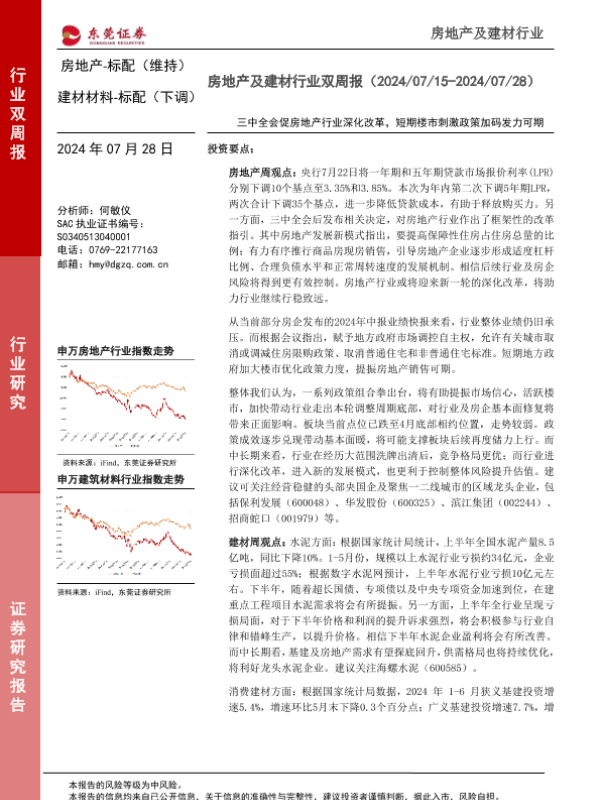 【东莞证券】【20240728】房地产及建材行业双周报:三中全会促房地产行业深化改革,短期楼市刺激政策加码发力可期-15页