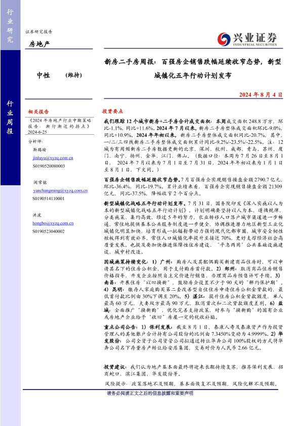 【兴业证券】【20240804】新房二手房周报:百强房企销售跌幅延续收窄态势,新型城镇化五年行动计划发布-14页
