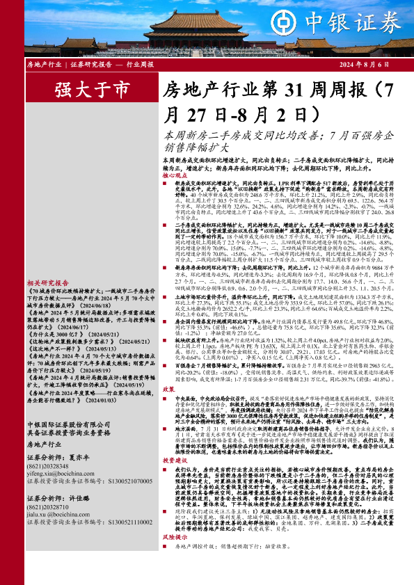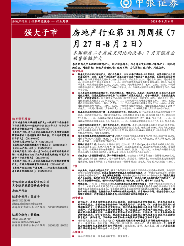 【中银证券】【20240806】房地产行业第31周周报:本周新房二手房成交同比均改善;7月百强房企销售降幅扩大-30页