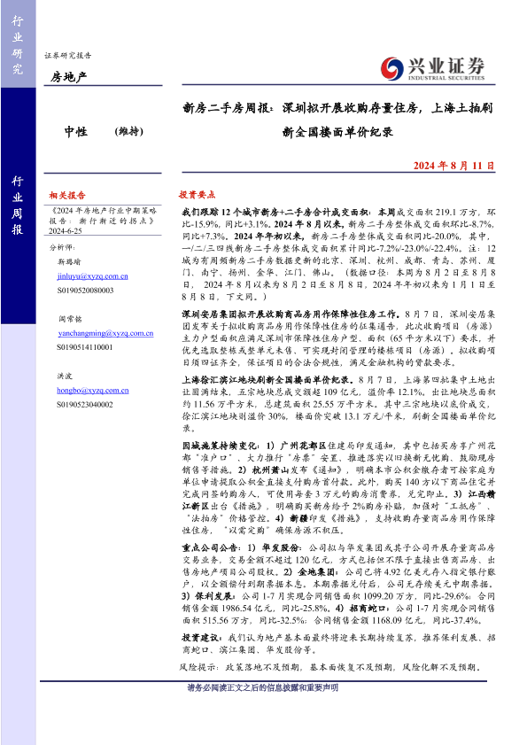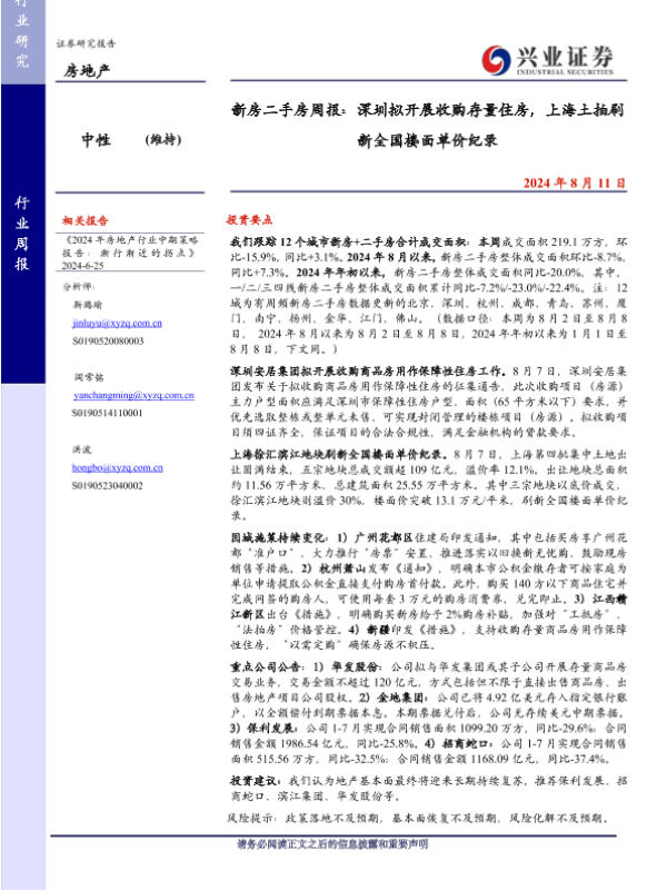 【兴业证券】【20240811】新房二手房周报:深圳拟开展收购存量住房,上海土拍刷新全国楼面单价纪录-14页