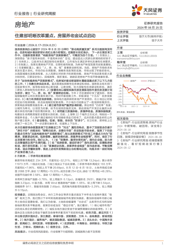 【天风证券】【20240825】房地产行业研究周报:住建部明晰改革重点,房屋养老金试点启动-14页