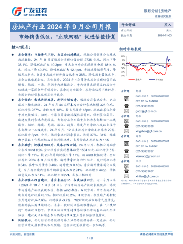 【广发证券】【20241103】房地产行业2024年9月公司月报:市场销售低位,“止跌回稳”促进估值修复-27页