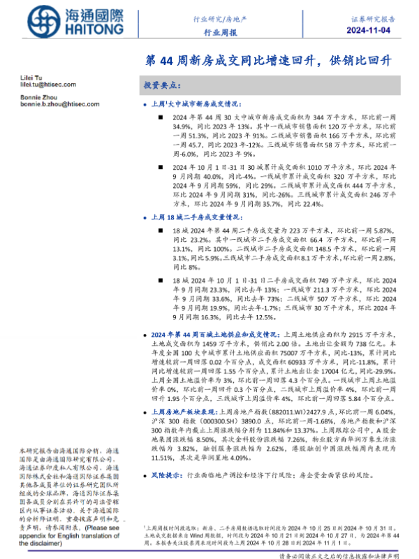 【海通国际】【20241104】房地产行业周报:第44周新房成交同比增速回升,供销比回升-13页