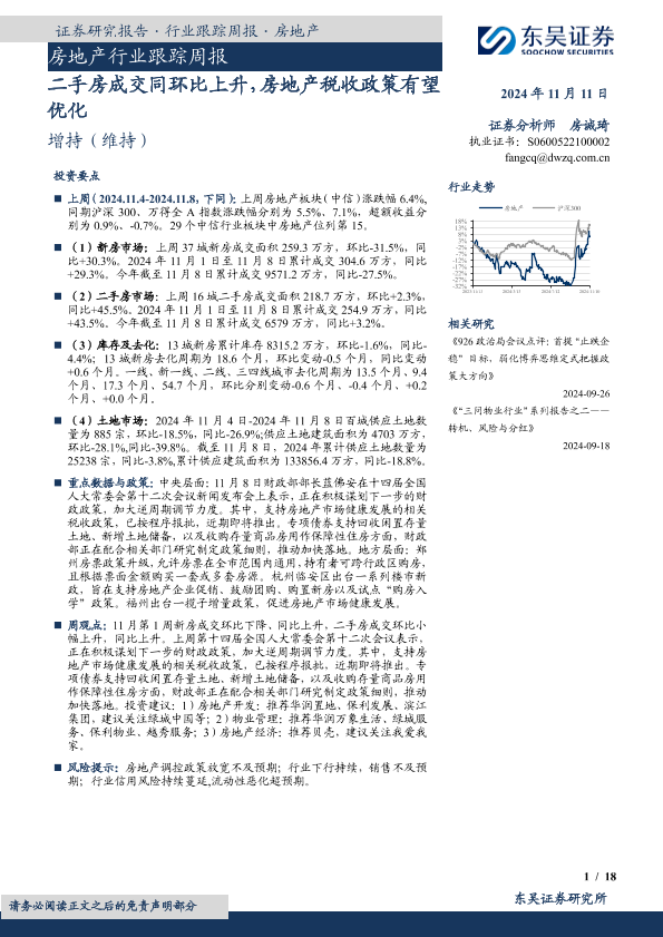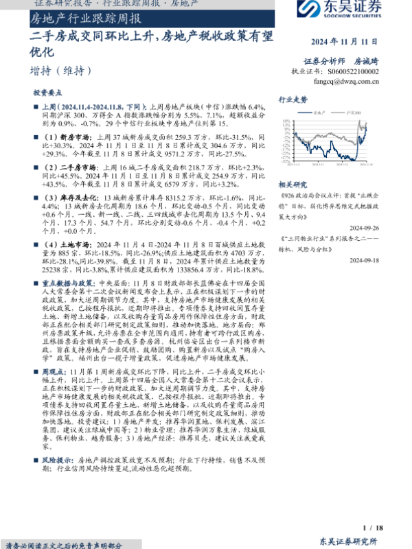 【东吴证券】【20241111】房地产行业跟踪周报:二手房成交同环比上升,房地产税收政策有望优化-18页