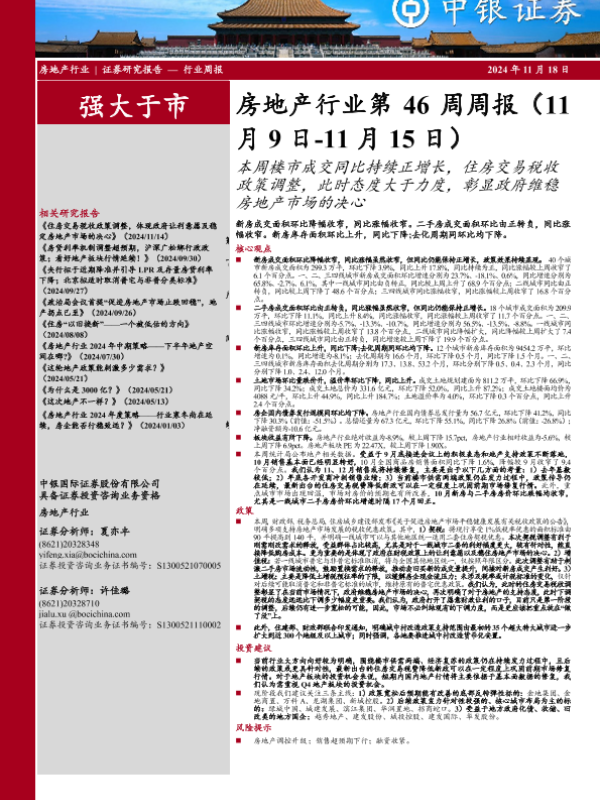 【中银证券】【20241118】房地产行业第46周周报:本周楼市成交同比持续正增长,住房交易税收政策调整-27页