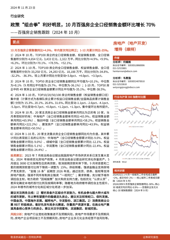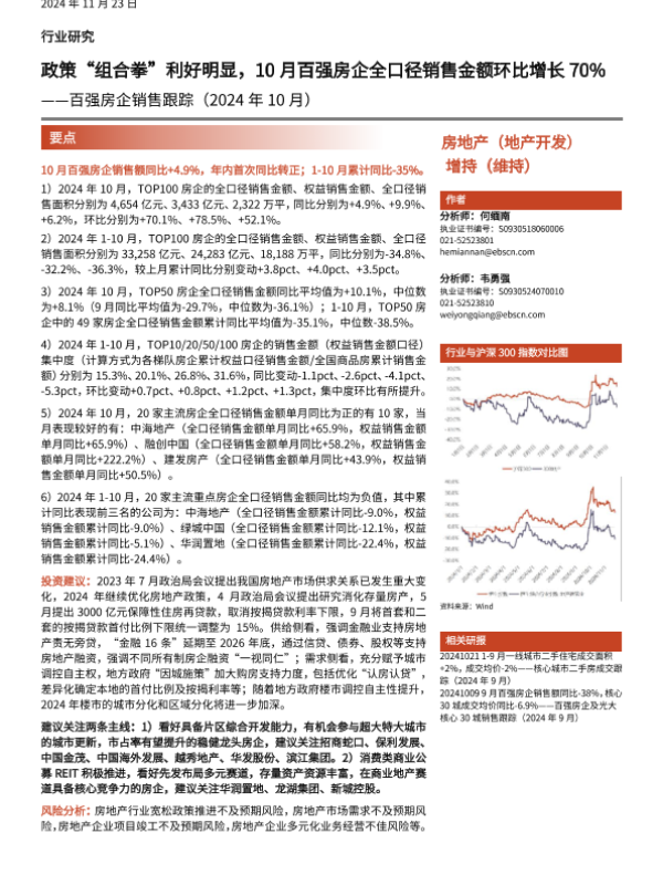 【光大证券】【20241123】百强房企销售跟踪(2024年10月):政策“组合拳”利好明显,10月百强房企全口径销售金额环比增长70%-11页