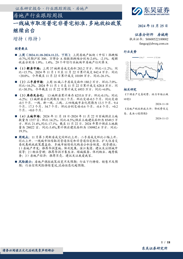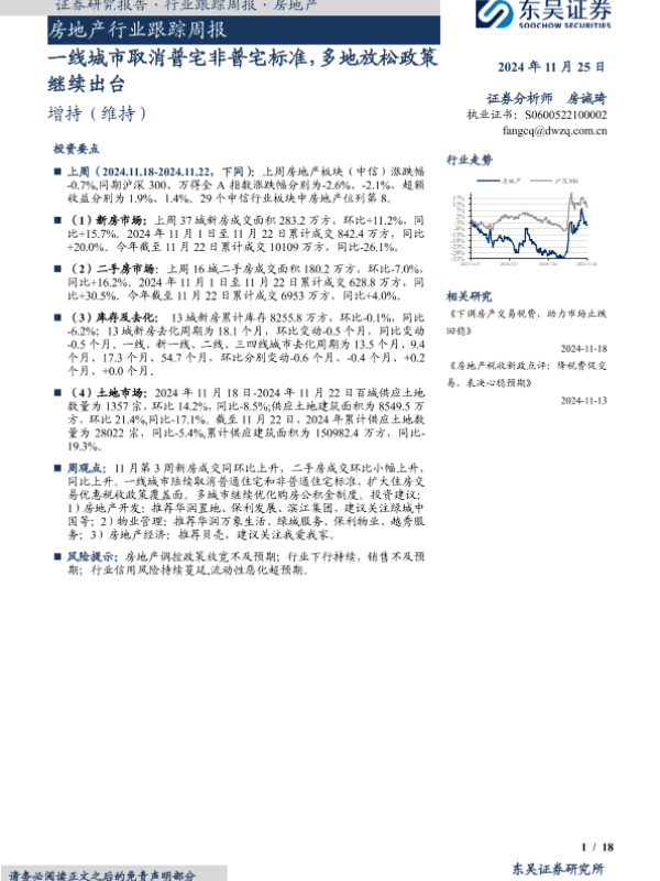 【东吴证券】【20241125】房地产行业跟踪周报:一线城市取消普宅非普宅标准,多地放松政策继续出台-18页