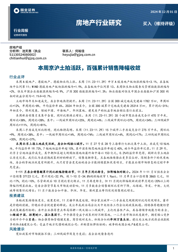 【国金证券】【20241201】房地产行业研究:本周京沪土拍活跃,百强累计销售降幅收敛-19页