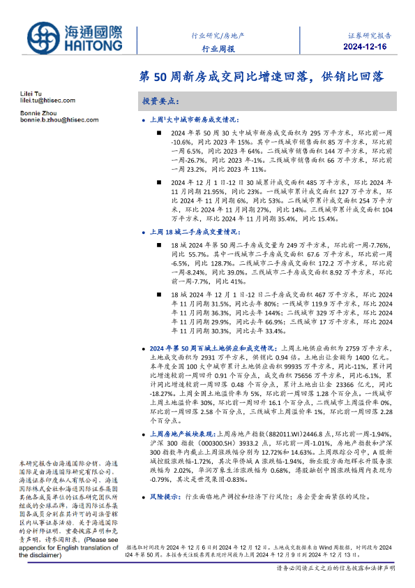 【海通国际】【20241215】第50周新房成交同比增速回落,供销比回落-13页