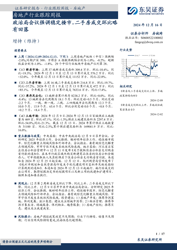【东吴证券】【20241216】房地产行业跟踪周报:政治局会议强调稳定楼市,二手房成交环比略有回落-17页