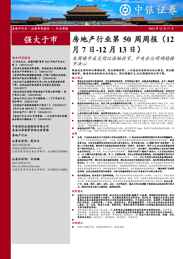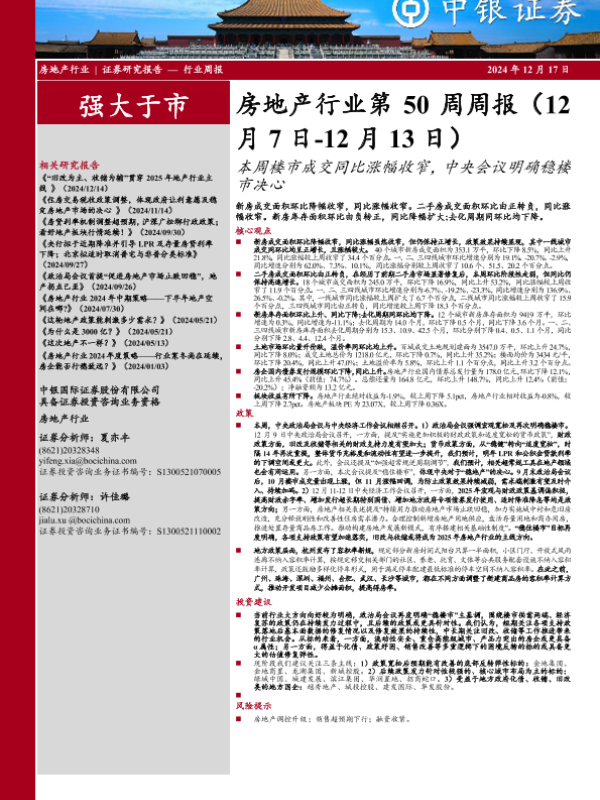 【中银证券】【20241217】房地产行业第50周周报:本周楼市成交同比涨幅收窄,中央会议明确稳楼市决心-27页
