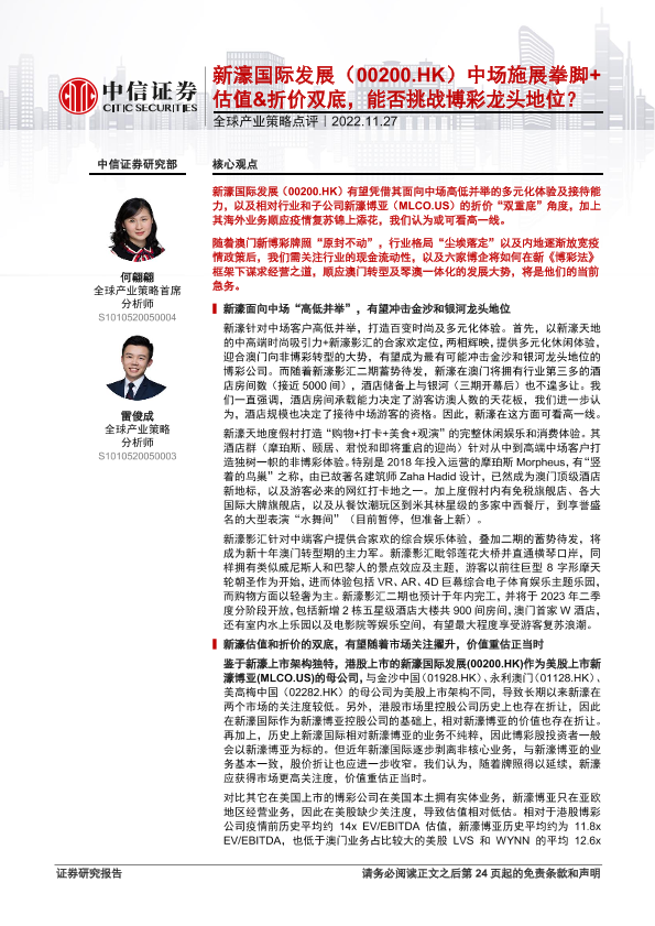 【中信证券】【20221127】全球产业策略点评:新濠国际发展中场施展拳脚+估值&折价双底,能否挑战博彩龙头地位?-25页