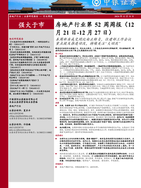【中银证券】【20241231】房地产行业第52周周报:本周新房成交同比由正转负,住建部工作会议重点提及推进旧改,持续关注“大旧改”-26页