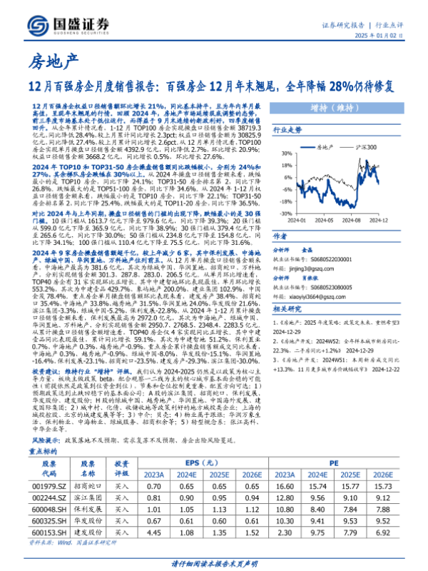 【国盛证券】【20250102】12月百强房企月度销售报告:百强房企12月年末翘尾,全年降幅28%仍待修复-10页