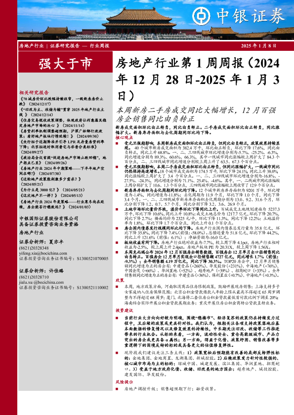 【中银证券】【20250108】房地产行业第1周周报:本周新房二手房成交同比大幅增长,12月百强房企销售同比由负转正-26页