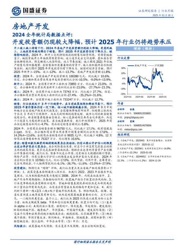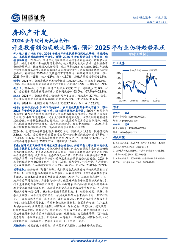 【国盛证券】【20250118】2024全年统计局数据点评:开发投资额仍现较大降幅,预计2025年行业仍将趋势承压-12页