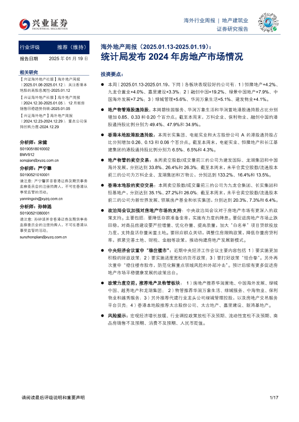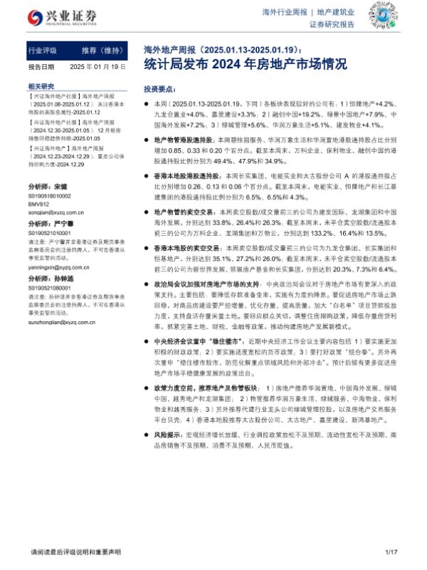 【兴业证券】【20250119】海外地产周报:统计局发布2024年房地产市场情况-17页