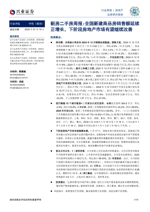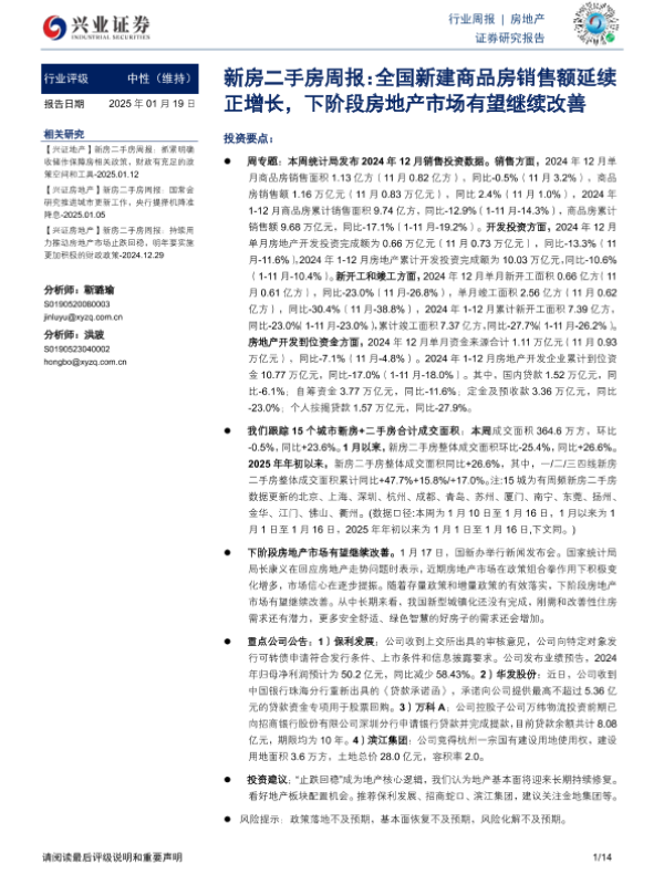 【兴业证券】【20250119】新房二手房周报:全国新建商品房销售额延续正增长,下阶段房地产市场有望继续改善-14页