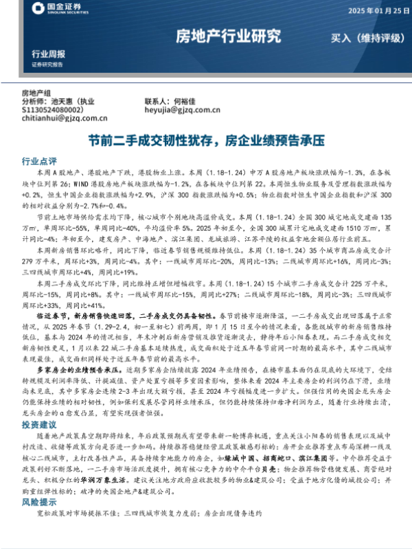 【国金证券】【20250125】房地产行业研究:节前二手成交韧性犹存,房企业绩预告承压-18页