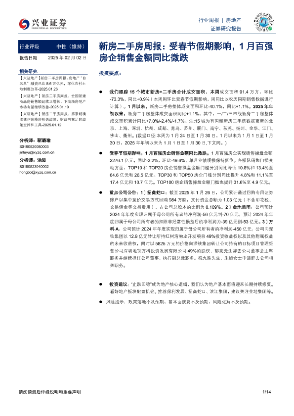 【兴业证券】【20250202】新房二手房周报:受春节假期影响,1月百强房企销售金额同比微跌-14页