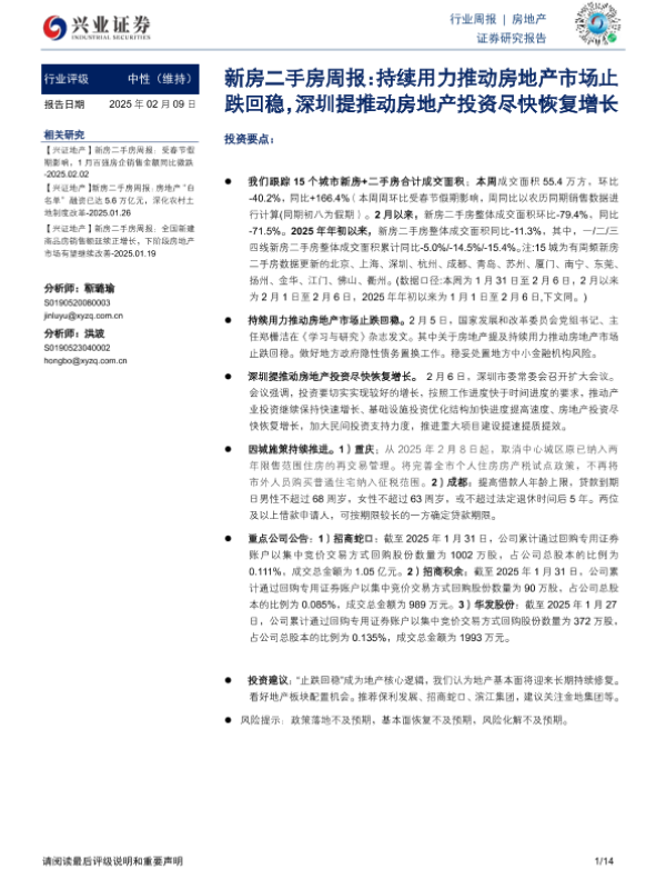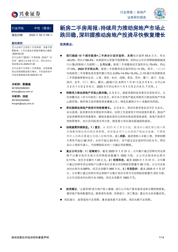 【兴业证券】【20250209】新房二手房周报:持续用力推动房地产市场止跌回稳,深圳提推动房地产投资尽快恢复增长-14页