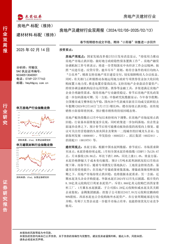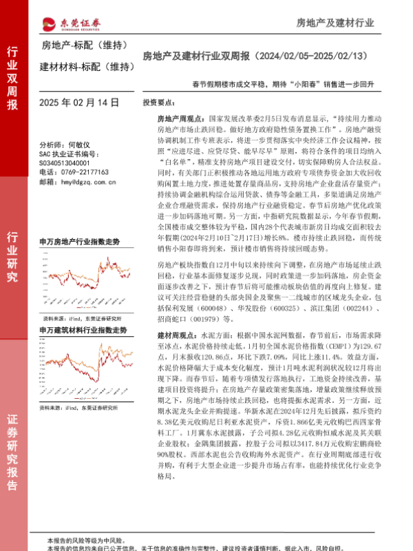 【东莞证券】【20250214】房地产及建材行业双周报:春节假期楼市成交平稳,期待“小阳春”销售进一步回升-15页