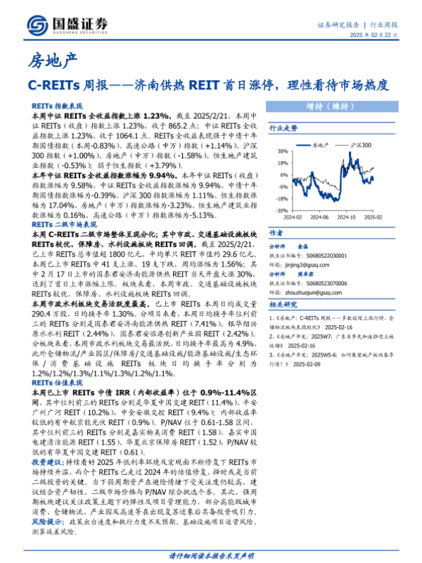 【国盛证券】【20250222】房地产C-REITs周报:济南供热REIT首日涨停,理性看待市场热度-11页