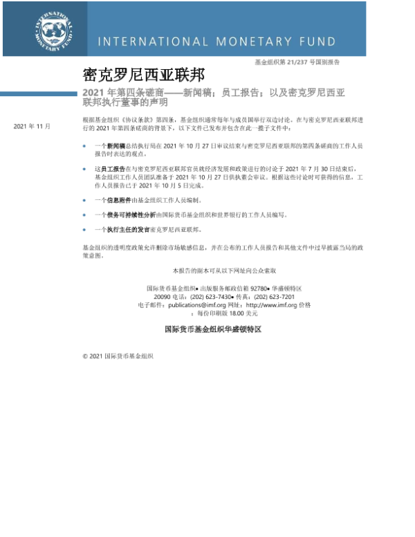 【IMF】【2021】密克罗尼西亚联邦:2021 年第四条磋商-新闻稿;员工报告;密克罗尼西亚联邦执行主任的声明-82页