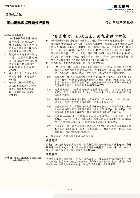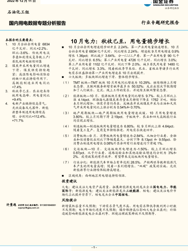 【国金证券】【20221211】公用事业行业10月电力:秋收已至,用电量稳步增长-18页