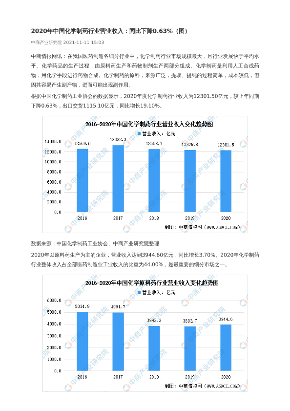 【中商产业研究院】【2020】2020年中国化学制药行业营业收入:同比下降0.63%-2页