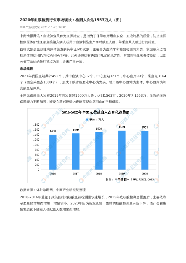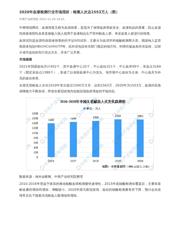 市场竞争 市场规模 无偿献血 核酸检测 血液检测