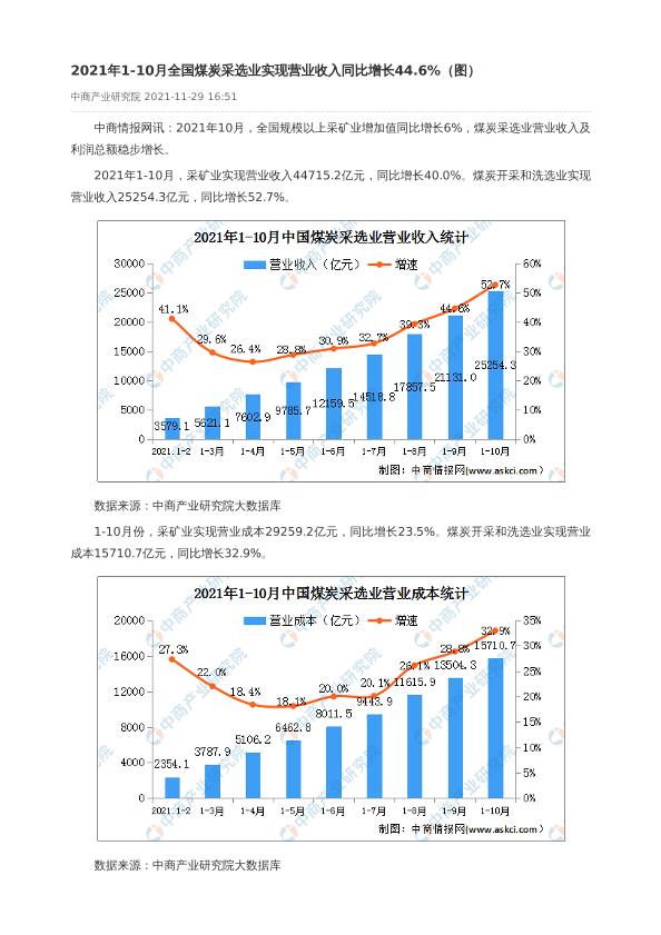 【中商产业研究院】【20211129】2021年1-10月全国煤炭采选业实现营业收入同比增长44.6%-2页