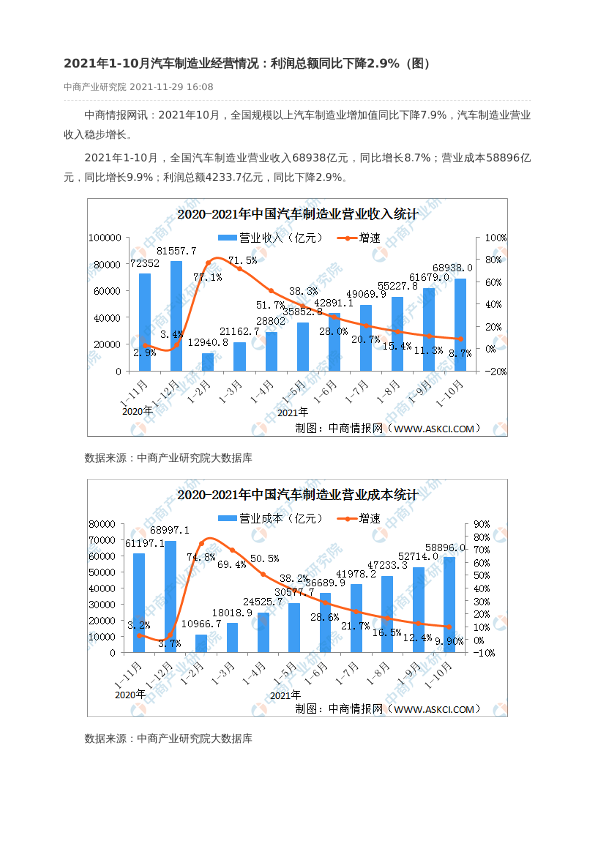 【中商产业研究院】【20211129】2021年1-10月汽车制造业经营情况:利润总额同比下降2.9%-2页