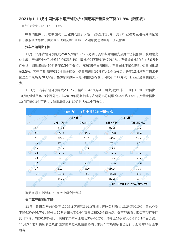 【中商产业研究院】【20211211】2021年1-11月中国汽车市场产销分析-3页
