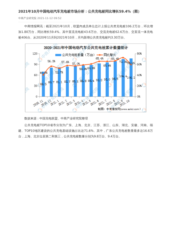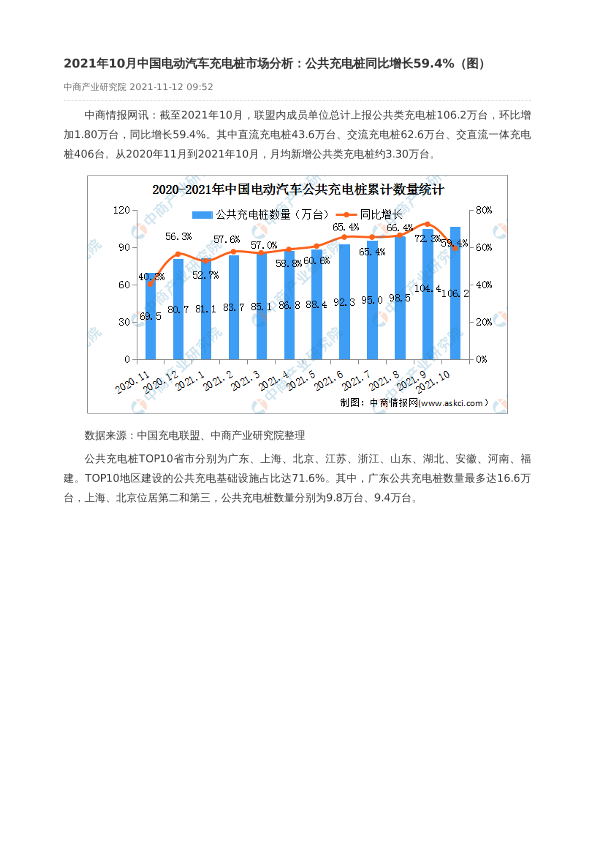 【中商产业研究院】【20211112】2021年10月中国电动汽车充电桩市场分析:公共充电桩同比增长59.4%-2页
