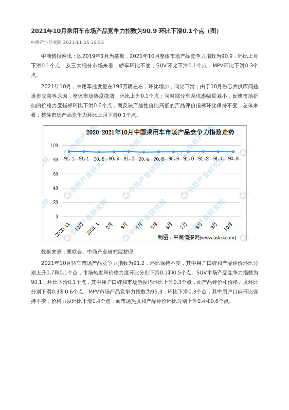 【中商产业研究院】【20211125】2021年10月乘用车市场产品竞争力指数为90.9 环比下滑0.1个点-2页